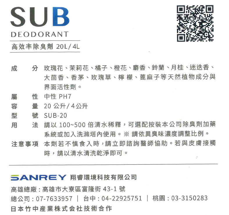 - Product Type: 高效率除臭劑SUB