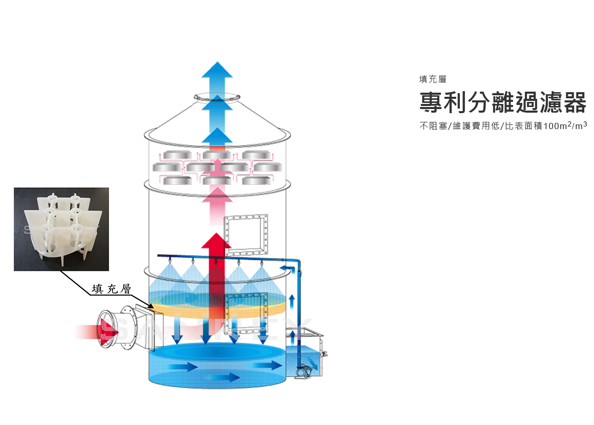 •翔睿環境的洗滌塔之特殊填充物設計可讓填充物比表面積(100m2/M3)( 接觸的比表面積介於90-110m2/M3為最佳設計)能夠讓液氣比優於一般市面上的填充物(120m2/M3)。